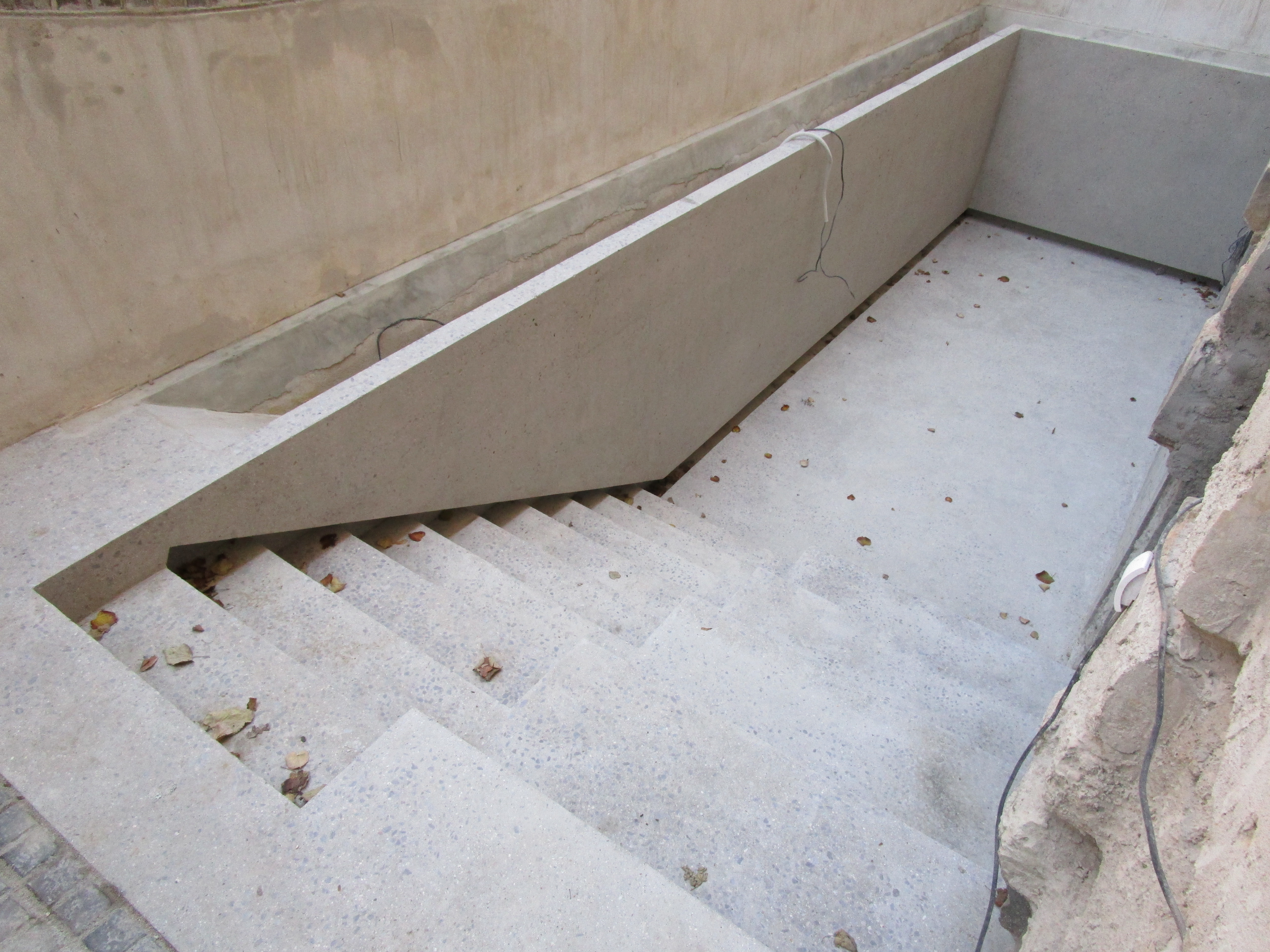 Kolem dvorku bude osázen květináč, který je součástí monolitické opěrné stěny. Opěrná stěna a všechny betonové plochy jsou celoplošně broušeny. Ve spodní části opěrné stěny ve skrytém odtokovém žlábku budou umístěny LED svítidla, která budou efektně osvětlovat nový prostor.